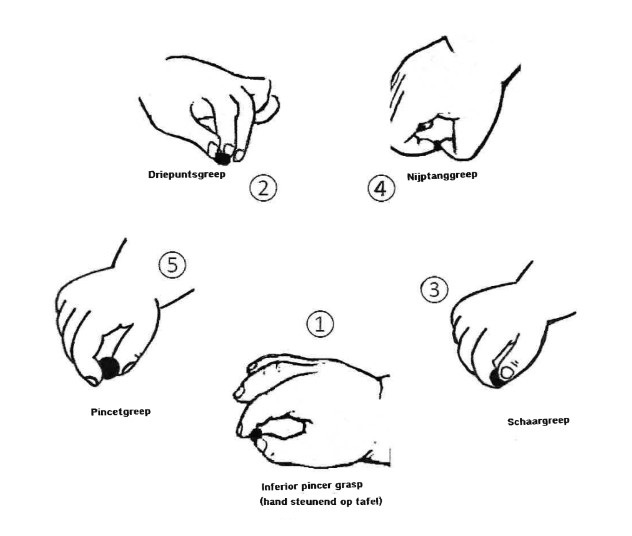 | Alarmsymptoom | Verwaarlozen (in functioneel gebruik) van een hand of arm, op elke leeftijd (Touwen, 1990). Het zijn vooral de kwalitatieve aspecten van de grijpfunctie die een signaal kunnen zijn van een ontwikkelingsachterstand. Sommige kinderen met een matige motoriek tonen de pincetgreep wel als die wordt uitgelokt, maar vallen in hun spontaan gedrag gauw terug op onrijpere vormen van grijpen. |