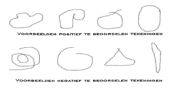 | Observatie | De onderzoeker observeert of het kind een gesloten, min of meer cirkelvormige figuur tekent. Enkele voorbeelden van positief en negatief te scoren tekeningen zijn weergegeven in de figuur. |
