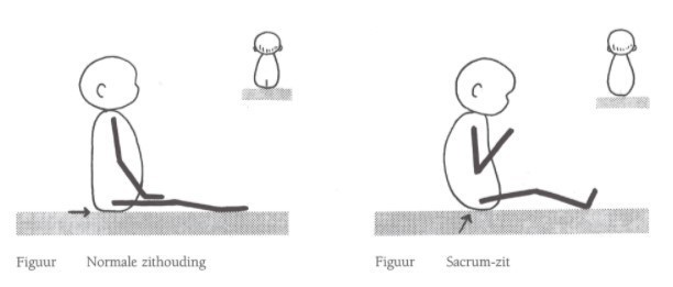 | Neurologisch aspect | Het zitten is op de leeftijd van 9 maanden zo ver ontwikkeld dat het kind in staat is te zitten met gestrekte rug en een goede romp en hoofdbalans. Ook wanneer de benen van het kind zijn (worden) gestrekt kan het kind deze houding handhaven. Het kind hoeft nog niet zelfstandig te kunnen zitten. Lichte zitkyfose komt nog voor, doch op het ondereinde van de rug zitten, de zogenaamde sacrumzit, is op deze leeftijd pathologisch. De bilspleet is bij laatstgenoemde zithouding niet zichtbaar (zie voor meer informatie hoofdstuk 3).