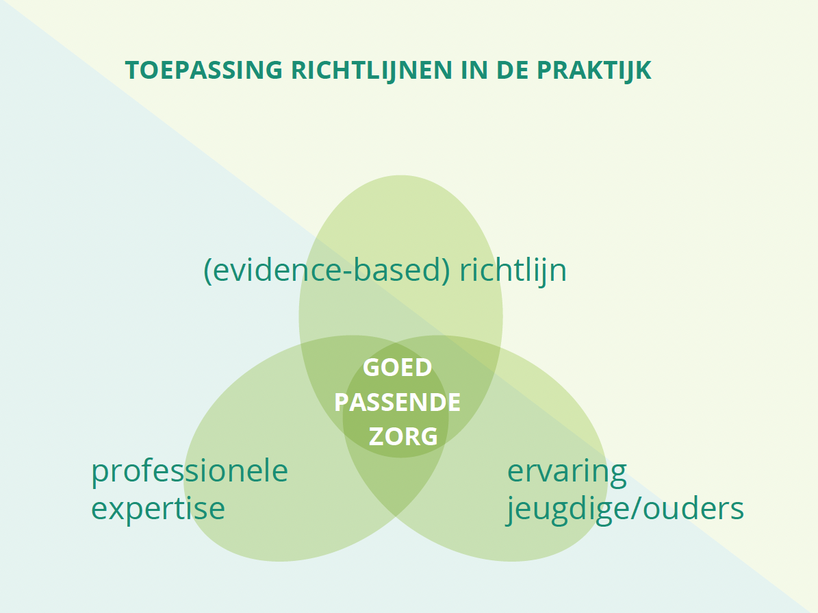 JGZ-richtlijnen geven richting aan het handelen van JGZ-professionals in de praktijk. Richtlijnen gaan altijd uit van het gemiddelde kind. De JGZ-professional maakt de vertaalslag naar wat het individuele kind op een moment in de gegeven context nodig heeft. Goede zorg is zorg die op maat aansluit en rekening houdt met álle 3 de perspectieven van evidence-based practice. Dit betekent dat je zowel de ervaring van de jeugdigen/ouders zelf, de (evidence-practice based) richtlijn als jouw eigen professionele expertise gebruikt om passende zorg te bieden.